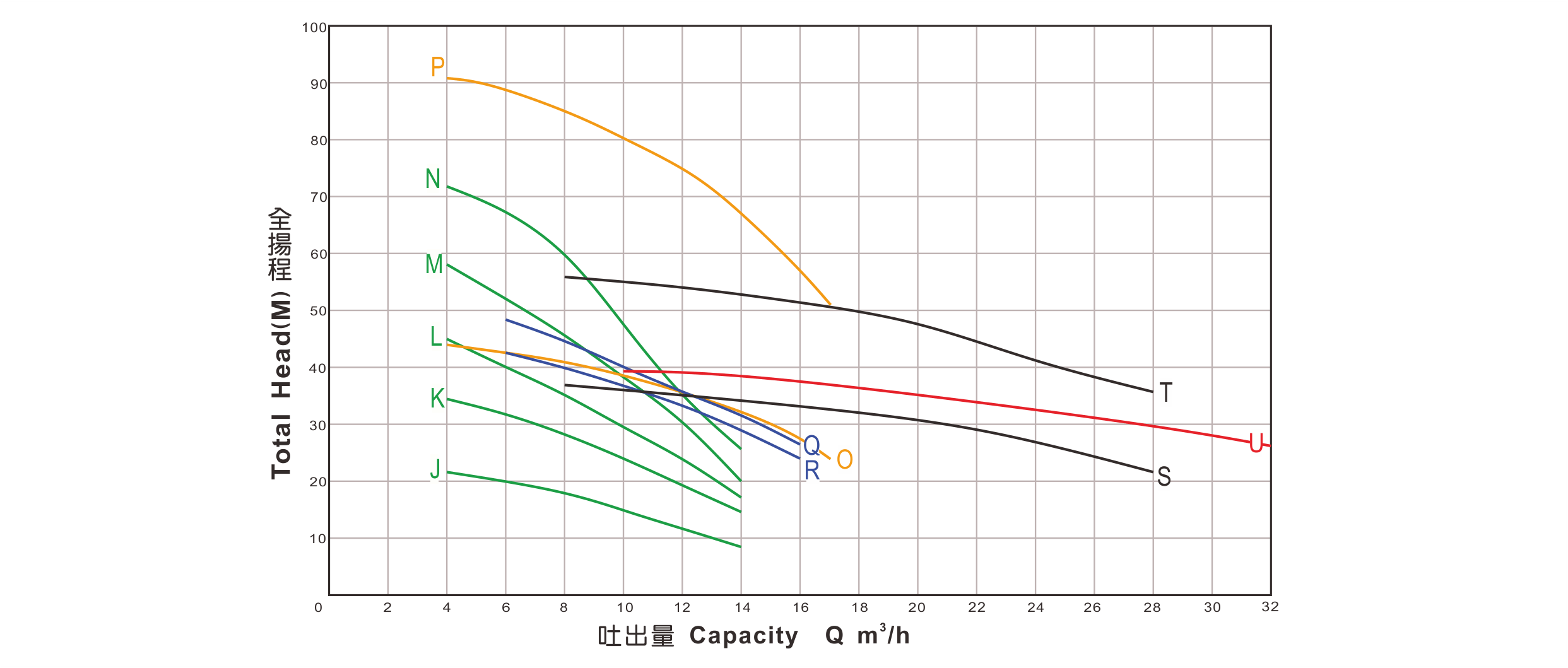 相數 | Q m3/h | 10 | 14 | 16 | 20 | 24 | 28 | 32 | 曲線代碼 |