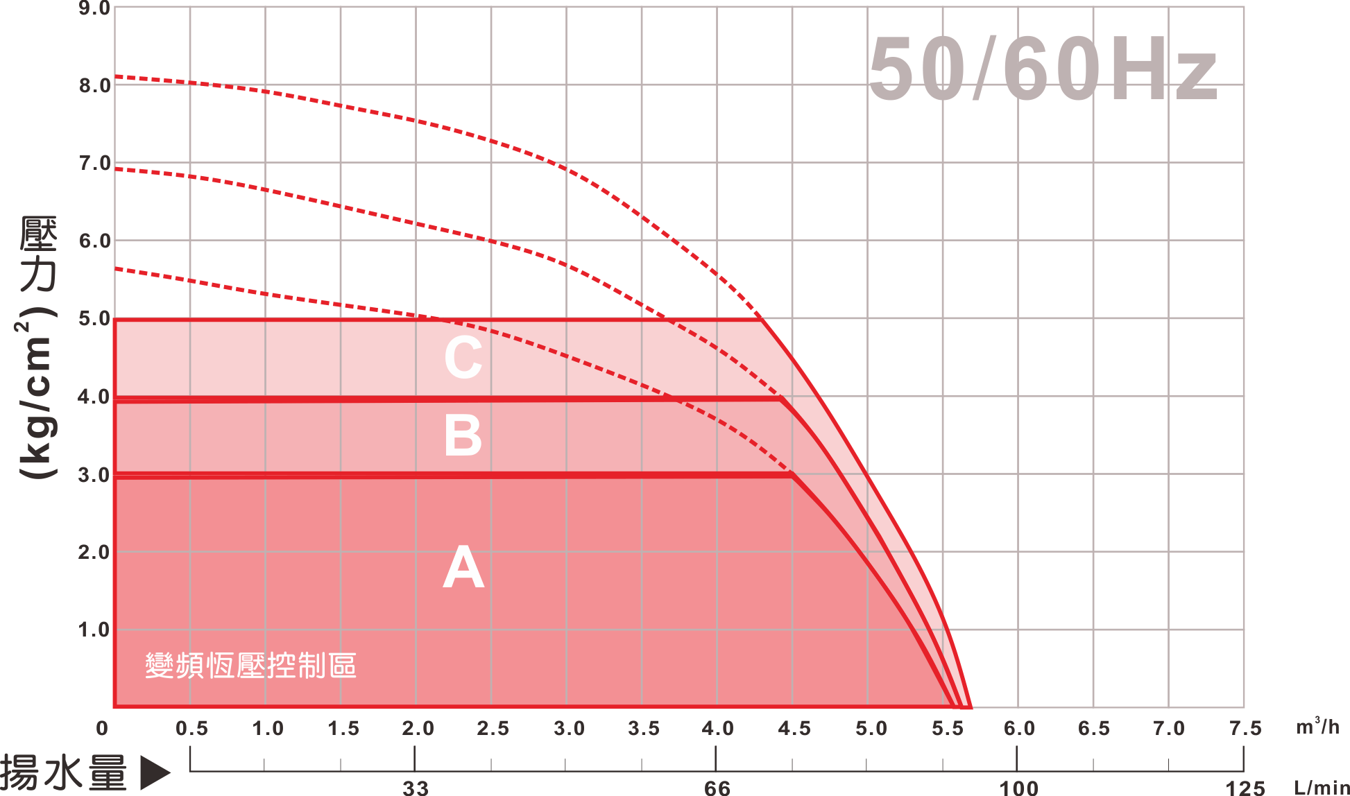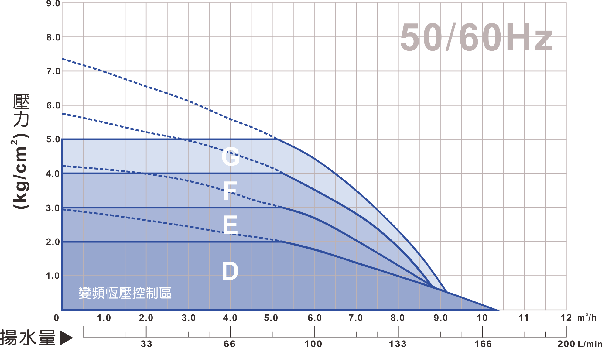 | 型號 | 馬力 | 口徑(入/出口內牙) | 相數 | 標準水量 | 標準揚程 | 恆定壓力 | 曲線代碼 |